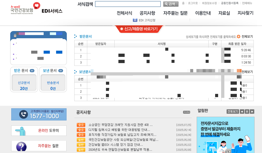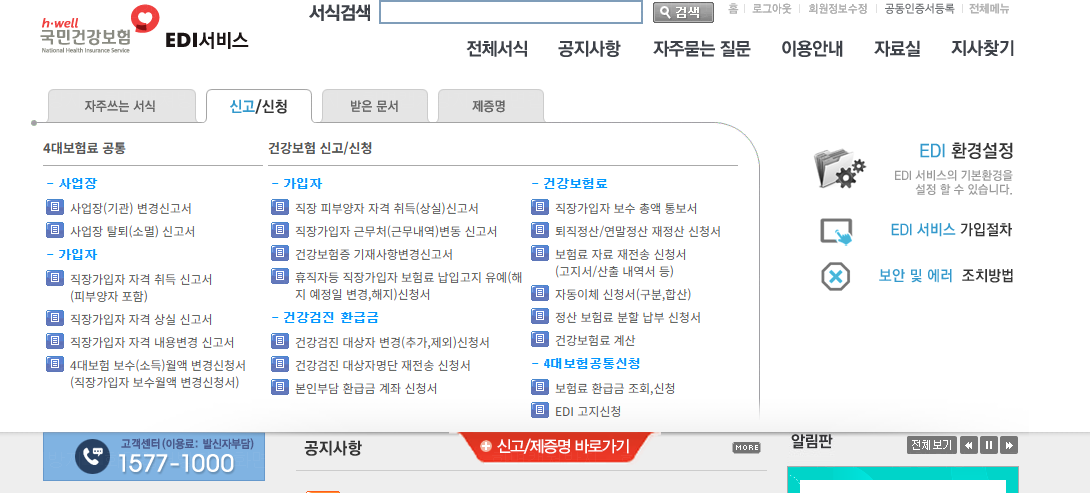 건강보험 EDI 서비스 홈페이지 로그인 후 상단에 빨간색으로 되어있는 신고/제증명 바로가기 클릭해 주세요.