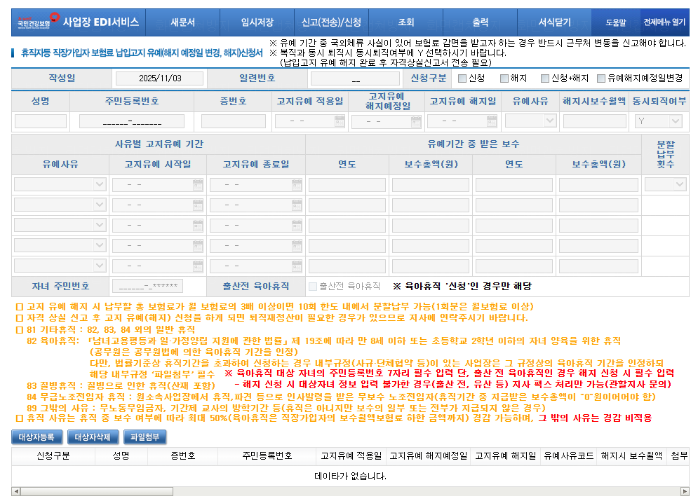 이번에는 건강보험 EDI 통해서 휴직자 납입고지유예 및 해지예정일 변경, 해지 신청서 작성하는 방법에 대해서 포스팅해 보겠습니다.