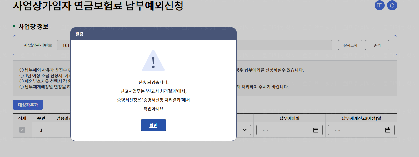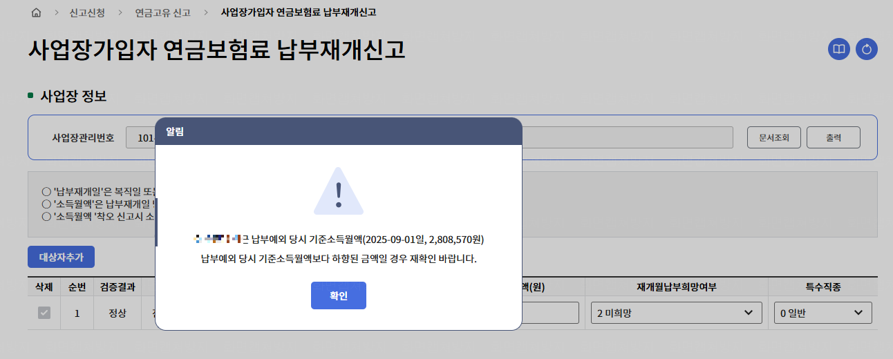 그럼 팝업이 뜨는데 해당근로자 신고했던 납부재개일과 예외신청 전 보수월액을 보여줍니다.