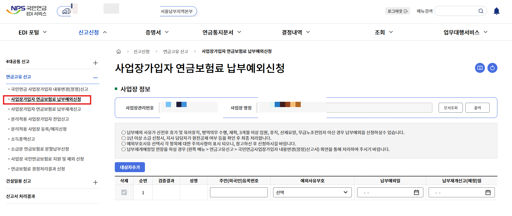 신고신청 -> 연금고유 신고 클릭하면 사업장가입자 연금보험료 납부예외신청/ 납부재개신고 카테고리가 보여요.