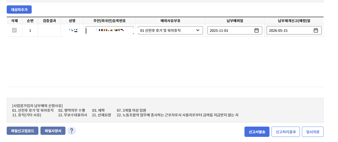 알맞은 예외사유부호 선택 후 납부예외일과 납부재개신고(예정) 일을 입력해 주세요.