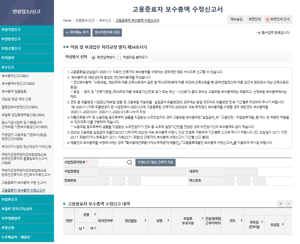 민원접수/신고에서 보수신고로 들어가시면 고용종료자보수총액수정신고서 있습니다.