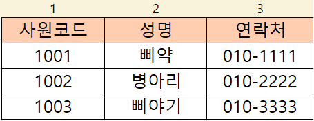 사원코드별로 성명과 연락처가 있는 데이터예요.