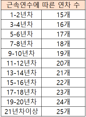 - 2년마다 1일씩 증가 최대 25일의 유급휴가 발생