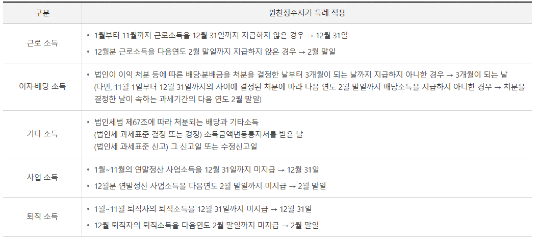 그럼 각 소득마다 원천징수시기 특례 적용을 알아보겠습니다.