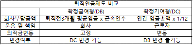 퇴직 불입액이 확정인 DC 제도와 퇴직급여가 확정인 DB제도로 나뉩니다.