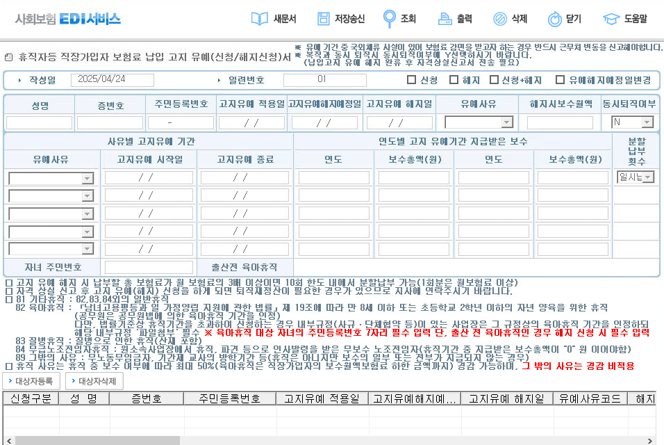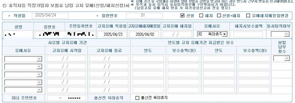 이번 2025.04.23 서식이 개정되어 안내드리려고 해요. 이제부터 직장가입자 보험료 납입고지 유예신청 또는 해지신청 시 해당 육아휴직대상자녀의 주민등록번호 앞 7자리를 함께 기재하여 신고를 해야 합니다.