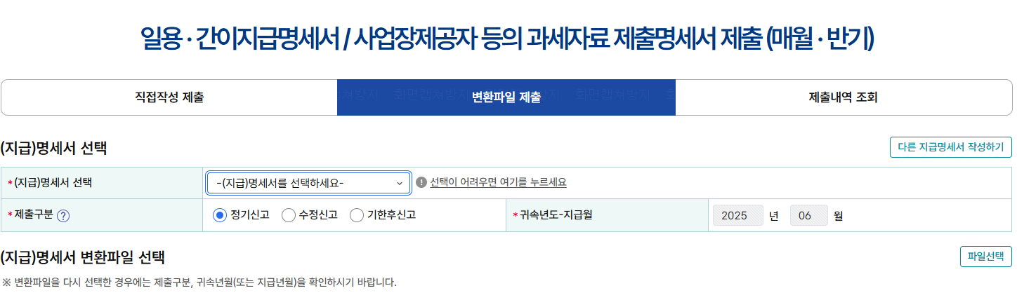 상단 메뉴 [지급명세/자료/공익법인] → [ 일용·간이지급명세서/사업장제공자 등의 과세자료 제출명세서 제출 (매월·반기) ] 선택 → [변환파일 제출]