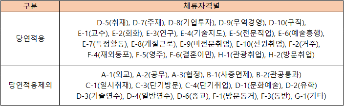 C-4(단기취업), E-1(교수), E-2(회화지도), E-7(특정활동), E-9(비전문취업), E-10(선원취업)