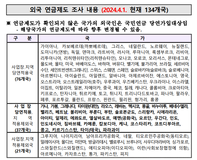 국가별 국민연금 가입대상국