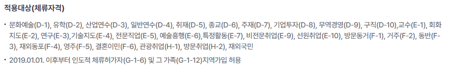 F-2(거주), F-5(영주), F-6(결혼 이민)의 체류자격일 경우에는 무조건 가입해야 합니다.