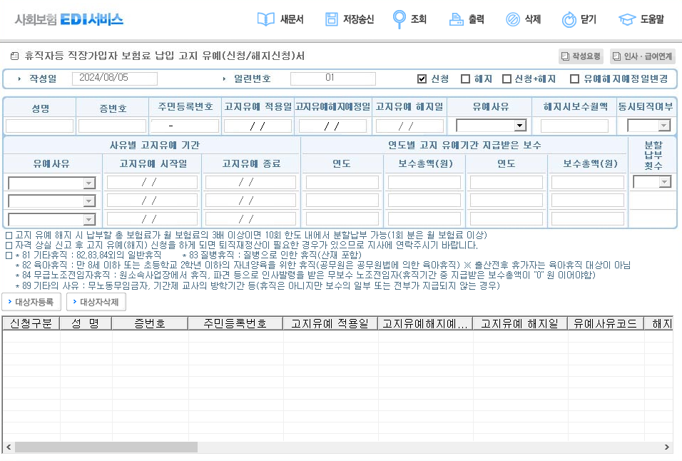 KTEDI 초기화면에서 신고서 작성 선택 후 건강에서 5. 휴직자등 직장가입자 보험료
